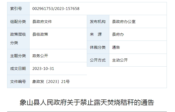象山縣人民政府 關(guān)于禁止露天焚燒秸稈的通告