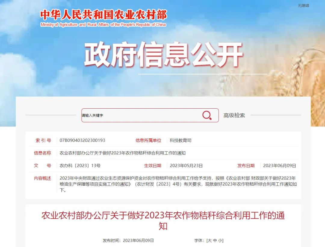 2023年中央財政通過農業生態資源保護資金對農作物秸稈綜合利用工作給予支持,按照《農業農村部 財政部關于做好2023年糧油生產保障等項目實施工作的通知》(農計財發〔2023〕4號)有關要求,現就做好2023年農作物秸稈綜合利用工作通知如下。