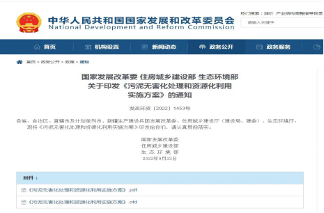 2022年9月27日,國家發改委、住建部、生態環境部聯合印發《污泥無害化處理和資源化利用實施方案》。