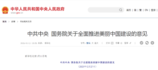 千呼萬喚始出來!繼全國生態(tài)環(huán)境保護(hù)大會(huì)系統(tǒng)部署,中央深改委第三次會(huì)議審議通過之后,1月11日,《中共中央 國務(wù)院關(guān)于全面推進(jìn)美麗中國建設(shè)的意見》(下稱《意見》)終于發(fā)布了